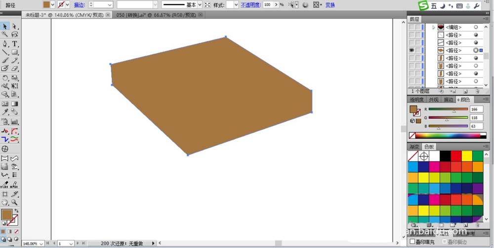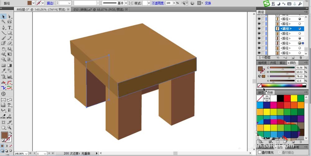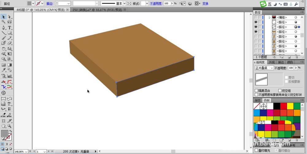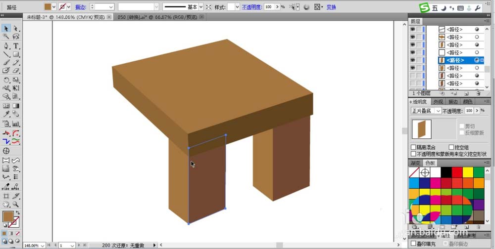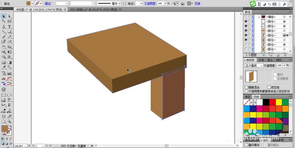 2、继续使用钢笔工具画出桌面的两个侧面,用不同的棕褐色填充,我们在填充方式上选择正片叠底。