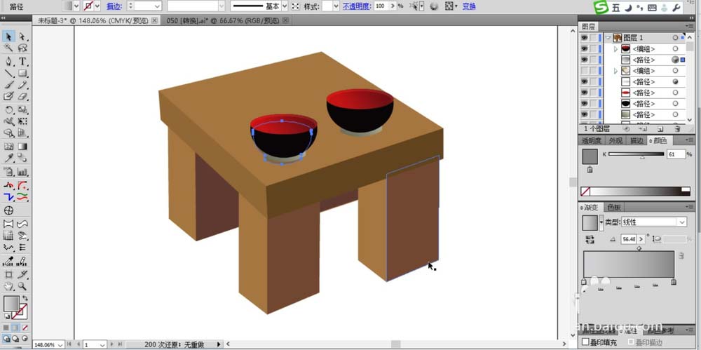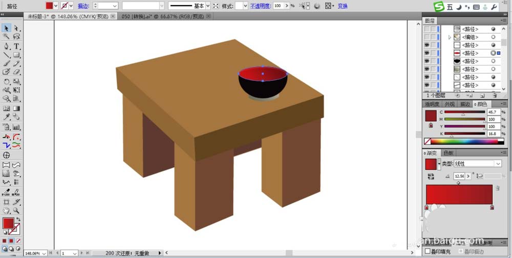 6、使用圆形工具与钢笔的圆弧在桌面上绘制出一个小碗,我们在碗内部填充为红色的渐变,碗的侧面填充为黑色,碗的底部填充为灰白色。绘制好第一个碗后再复制出第二个碗。