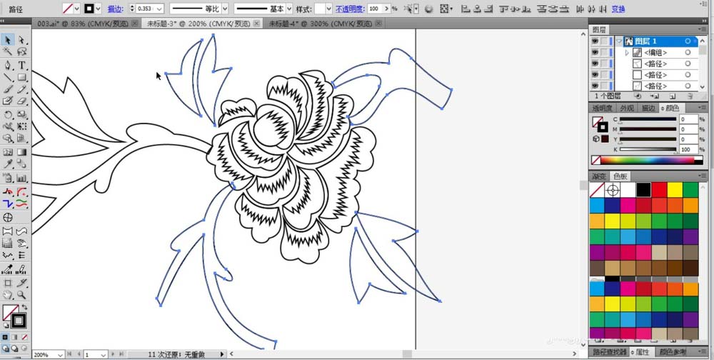 4、在图片的左侧下方画出一朵花的路径,也是使用曲线工具来绘制出很多的花瓣。
