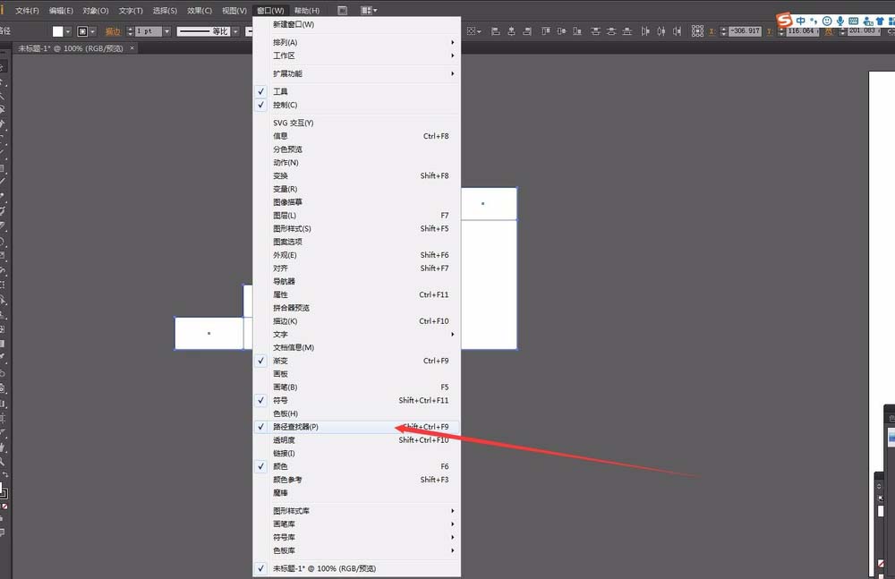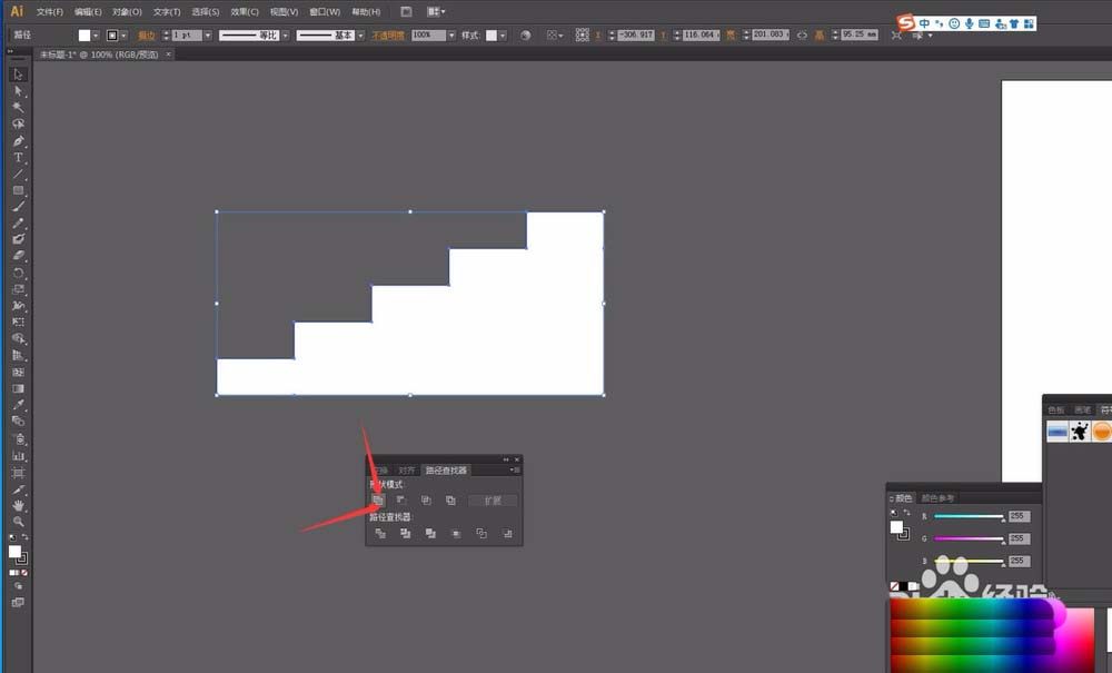 5、然后在窗口菜单中调出路径查找器命令。选中全部的矩形,点击联集,将这些矩形合并为一个整体的图形。然后在效果菜单中找到3D命令