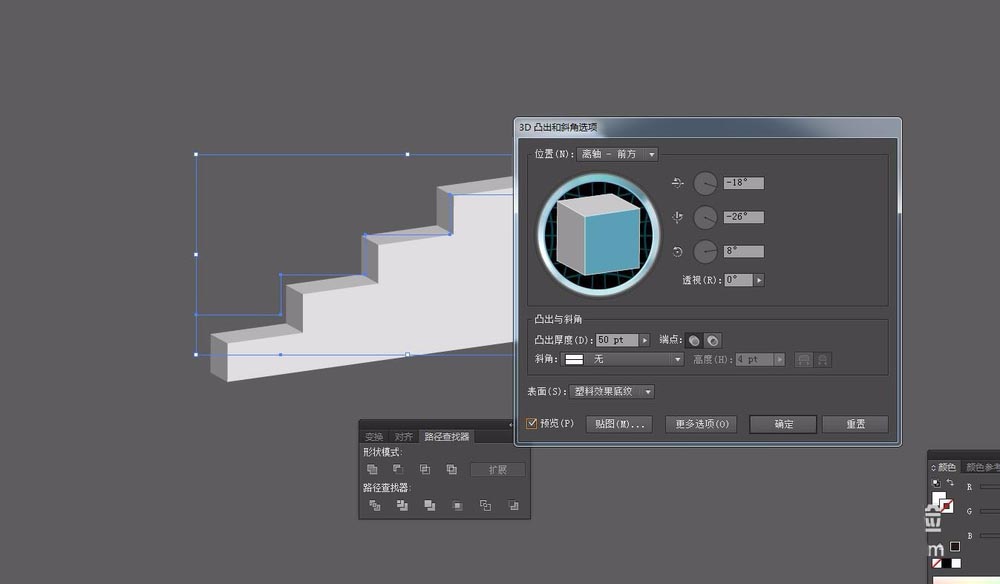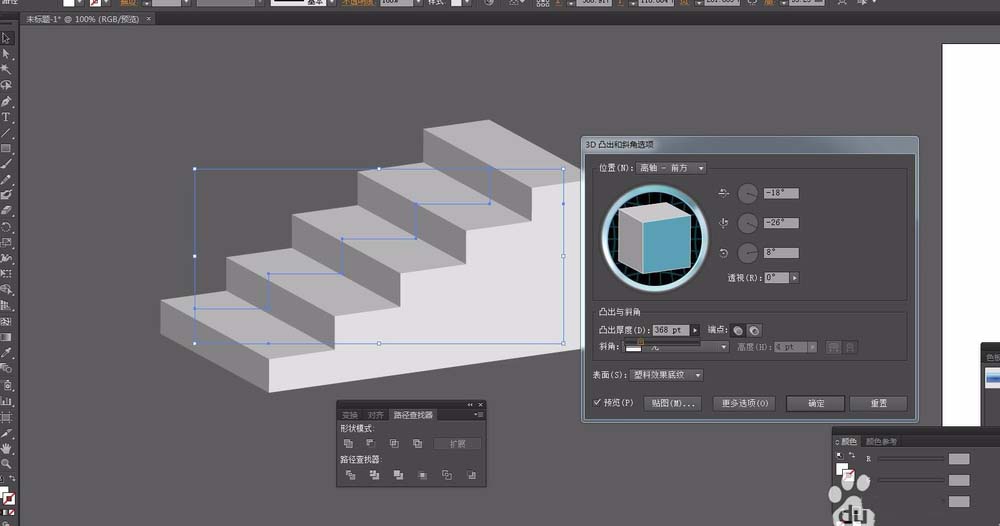 7、凸出的厚度加大,可以看到楼梯的效果就出来了。点击确定,也可以用选择工具,拖动来修改大小厚度。想要彩色的,可以直接选取颜色就可以了。