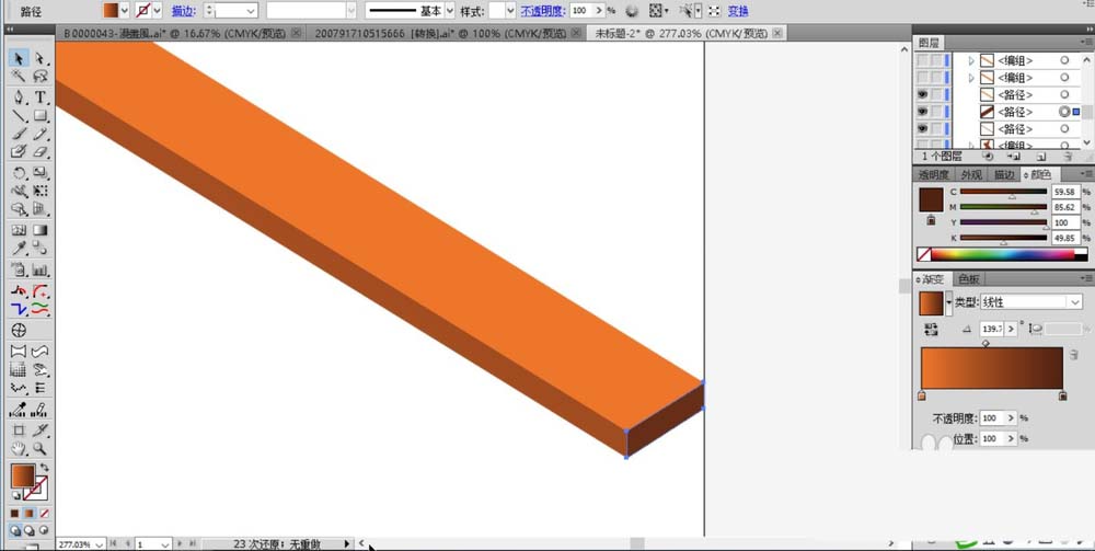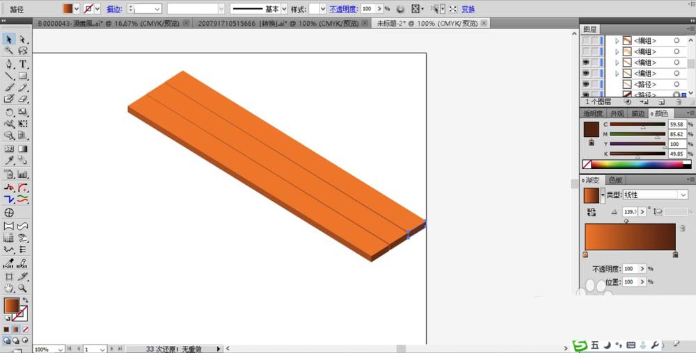 1、先来绘制出组合凳子的木块,我们绘制出这块木料的三个面,顶面、左侧面、右侧面,我们填充这三个面为红褐色的渐变,不同的渐变角度就会呈现不同的色调。让三个面的色调有所不同。