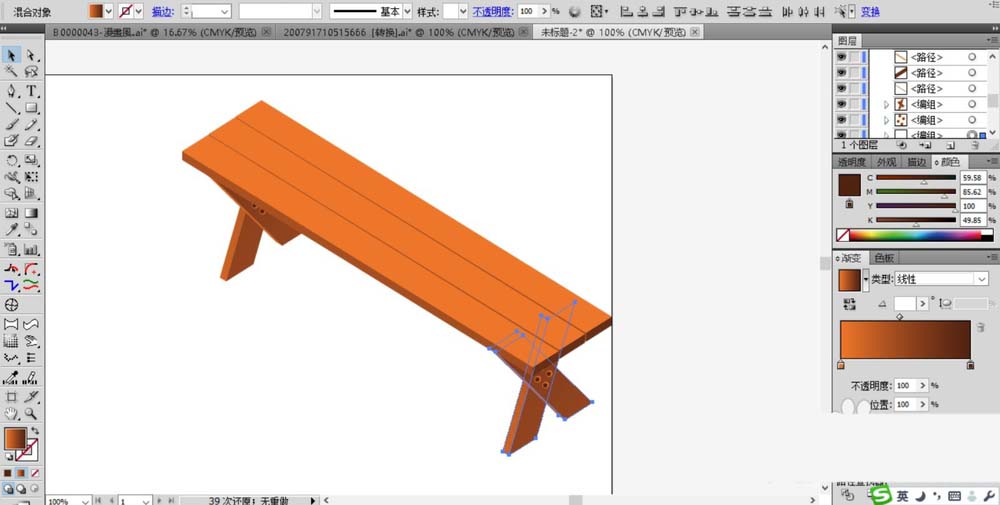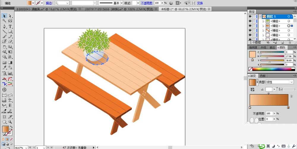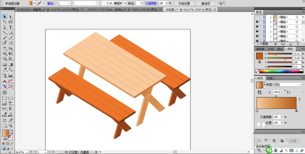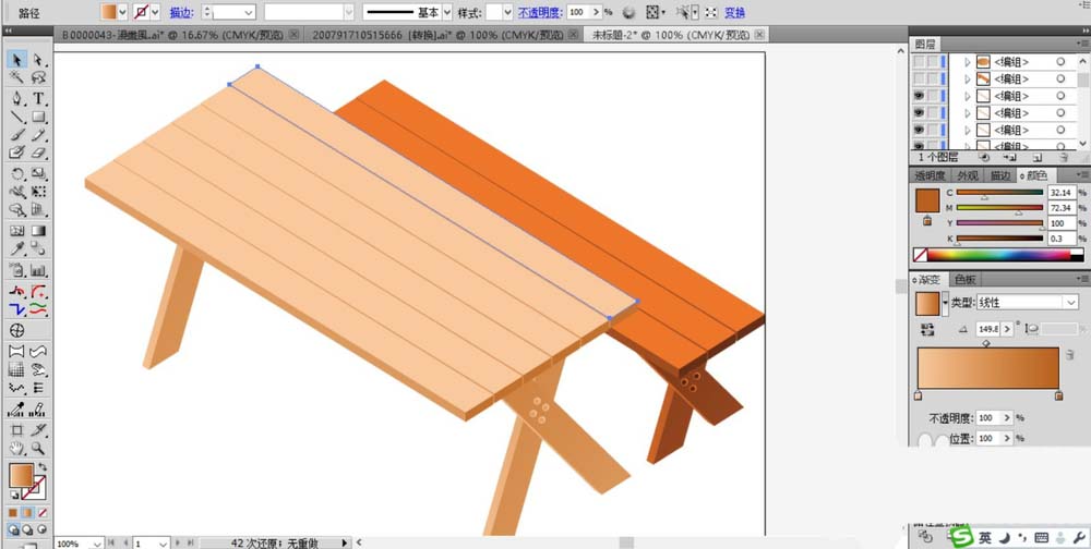 4、桌子比凳子大且高,所以,我们复制出更多的木料组合成桌面,绘制出来的桌脚也更高一些。桌面填充淡粉色的渐变,桌脚填充黄褐色的渐变。
