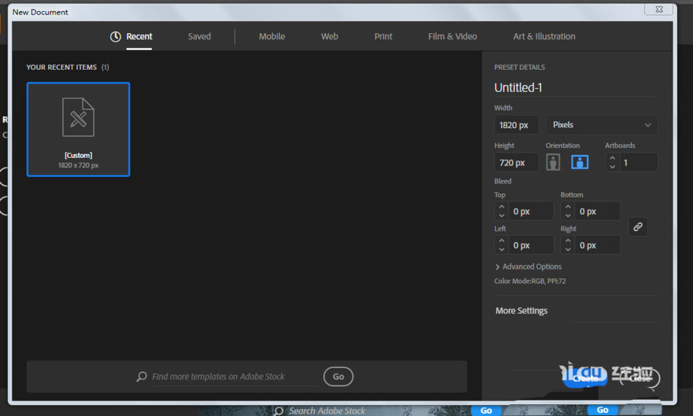 1、新建一个1820*720,颜色模式为RGB的文档。