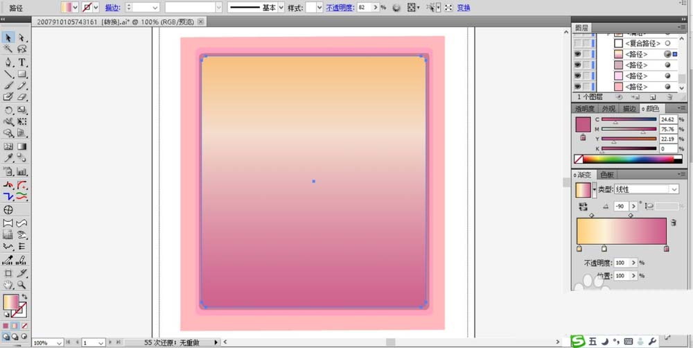 2、在正面的小框当中填充粉色的渐变,让粉色从明到暗的发生渐变,角度在120度左右。