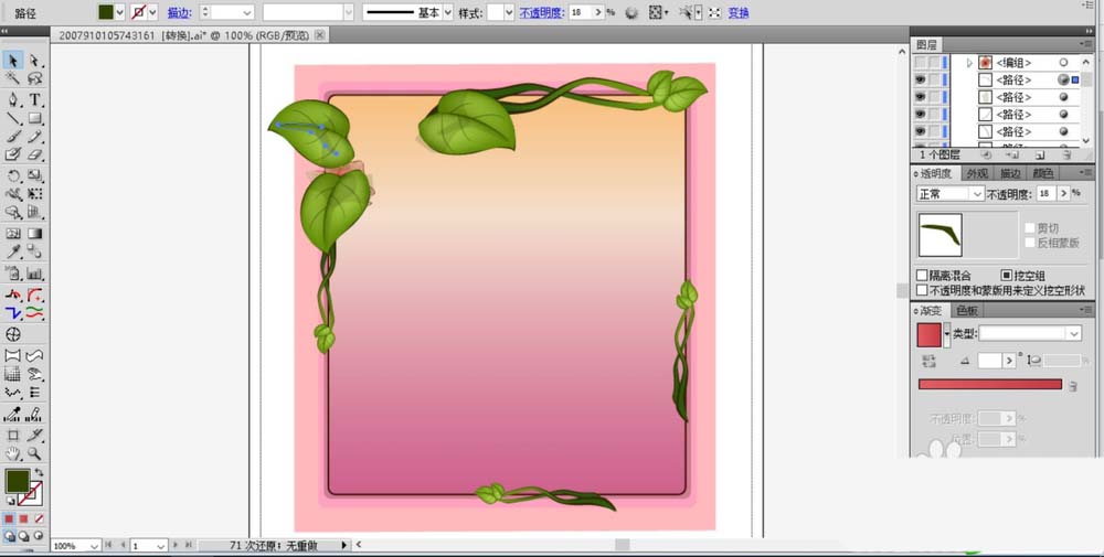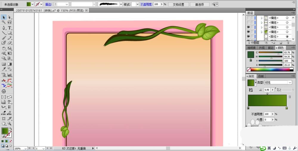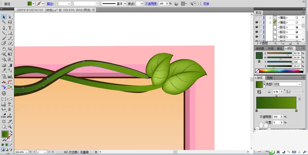 3、在花框的上方开始绘制两根花的藤蔓,绿叶我们用网格画法绘制出绿色的渐变,而左侧的藤蔓用绿色的渐变填充。