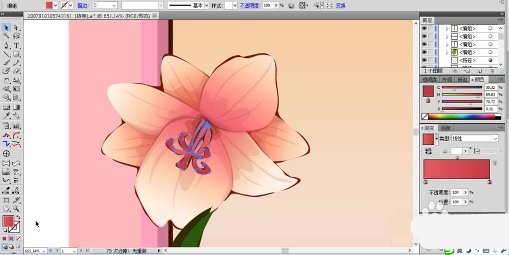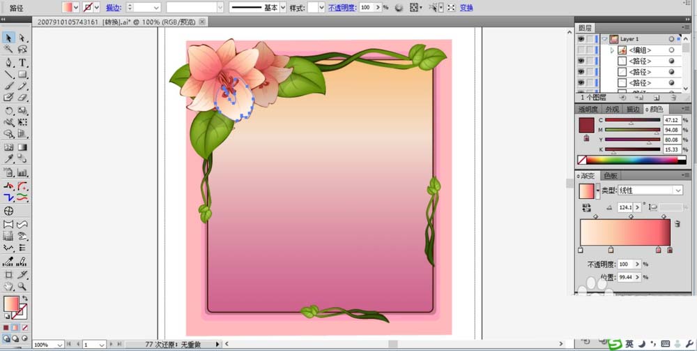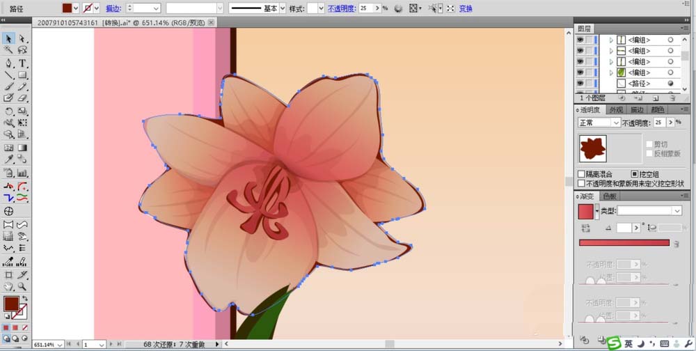 5、在花框的左侧开始绘制一朵小小的盛开的花朵。我们先画出花瓣的路径再用粉色的渐变填充,中心位置直接用粉红色的渐变填充花蕊,而整个花朵的色调用半透明的红棕色的渐变来调节。