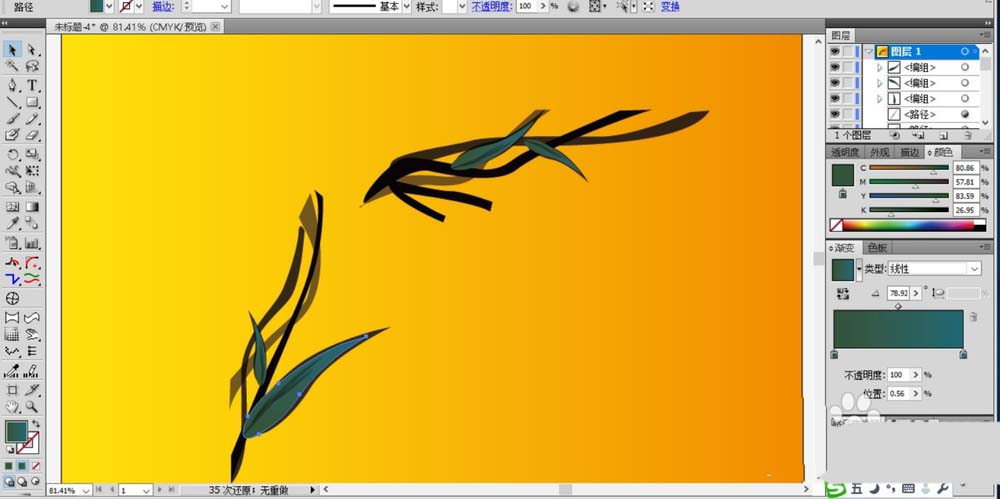 4、在枝条上面用钢笔勾勒出绿叶的路径并填充为绿色的渐变。