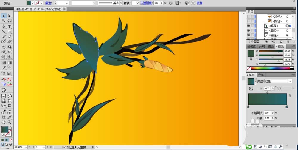 5、在画面的左上方绘制出四片大大的叶子并填充为绿色的渐变,这就是花朵所在的地方。