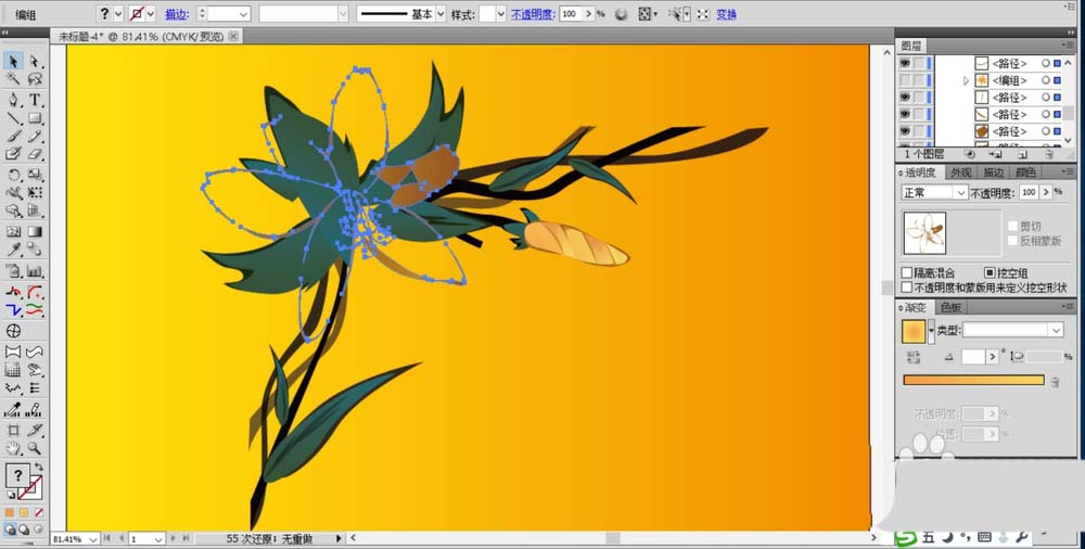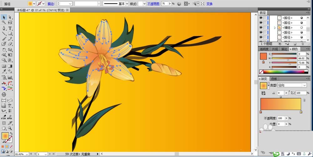 7、这一步开始绘制花朵,我们先用钢笔勾勒出一个花朵的轮廓并进行金色的描边,这就是花朵的阴影所在,继续填充路径以橙红色的径向渐变。花朵上面的亮区用半透明的白色来呈现。