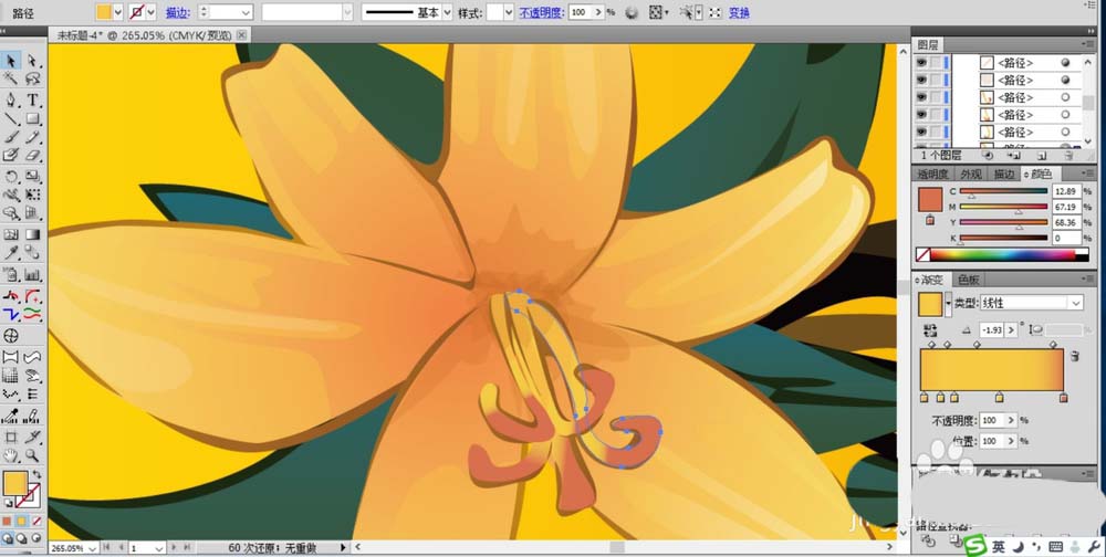 8、在花朵的中心位置绘制出多个花蕊的路径,我们设置从黄色到橙红色的渐变,从而让花蕊自然的呈现出来,美丽花朵简笔画完成!