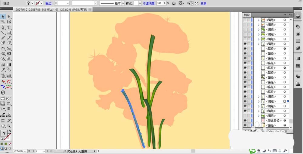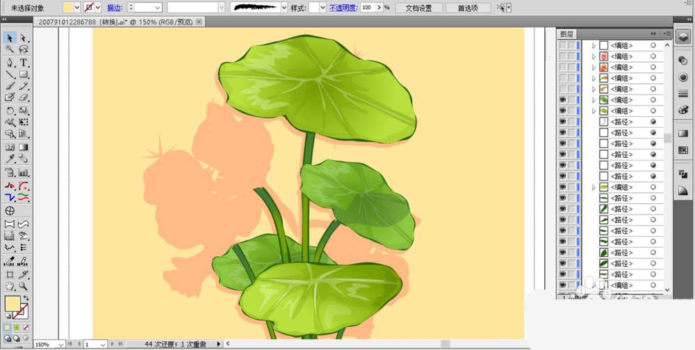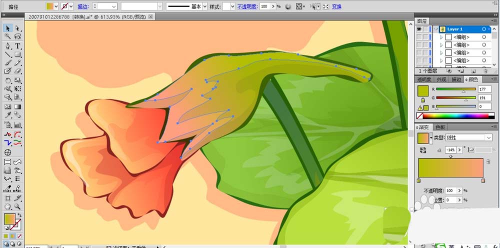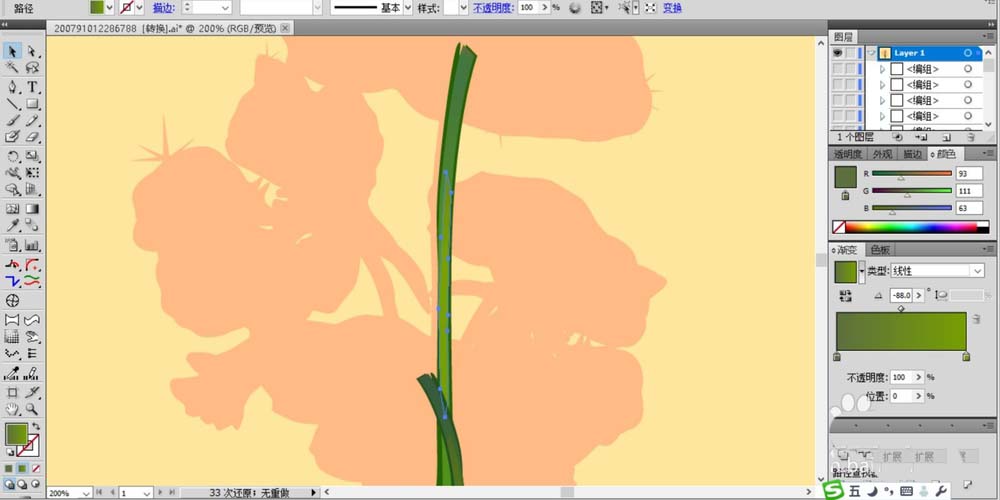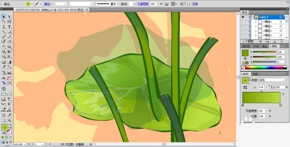 3、 有了茎杆就可以来绘制绿叶,我们先勾勒出叶片的基本轮廓并填充一个深绿色,再描绘出叶片上面的暗区与亮区,亮区用浅绿色的渐变填充,暗区用半透明的绿色来呈现。更多的细节用更多不同透明度的绿色来一一描绘与填充。有了一个叶片之后就可以复制出更多的叶片,我们对于叶片使用不同透明度的遮罩,从而让叶片之间的色调各有不同。