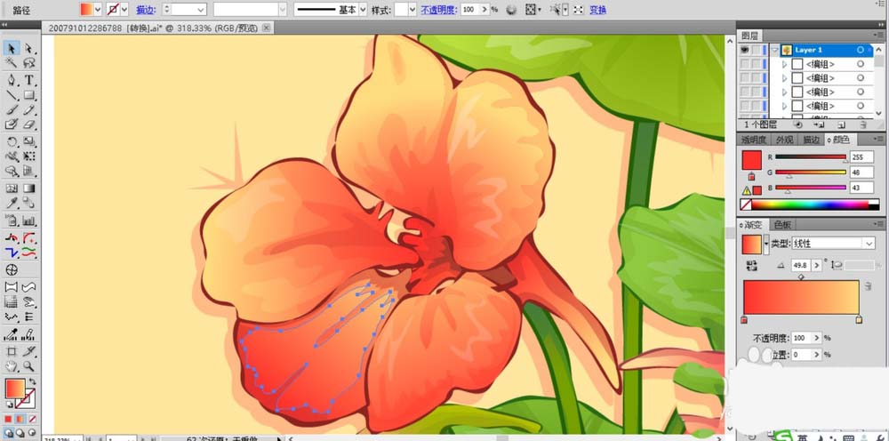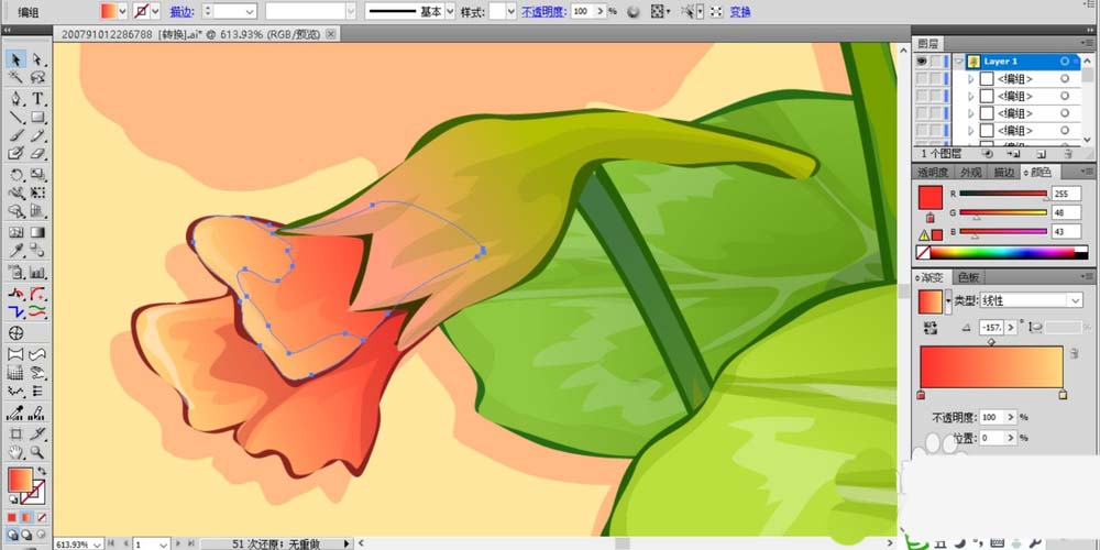 5、继续绘制大的盛开的红花,我们用使用红色到橙黄色的渐变呈现花朵的色调,上下花瓣的色调是相反的,我们只要调整一下渐变的角度就可以实现。把不同的花朵复制到不同的位置并改变大小与色调。