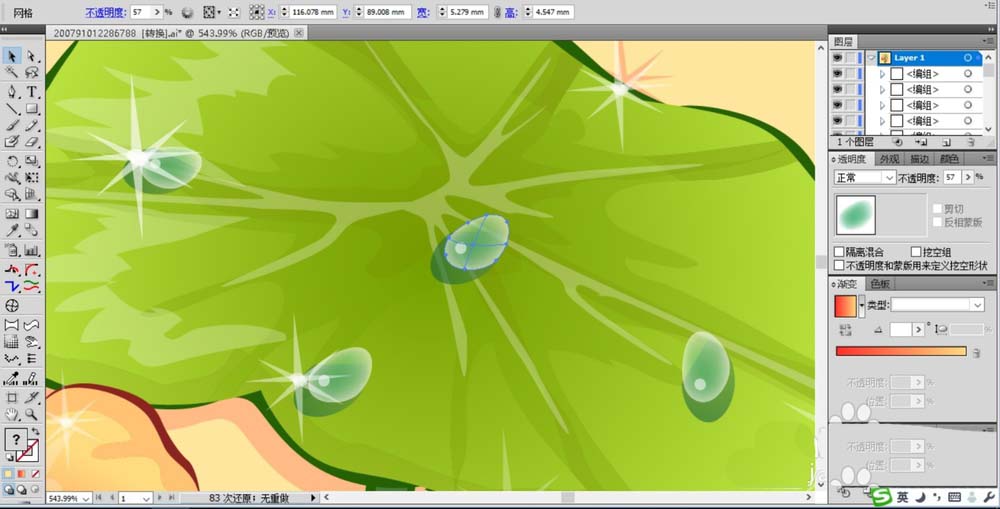 7、使用网格制作白色到绿色的渐变,设置透明度为30%左右,并描绘出一个绿色的阴影,这就是大的水莲花叶片上的水珠,描绘出一个再复制出多个水珠,水莲花简笔画完成!