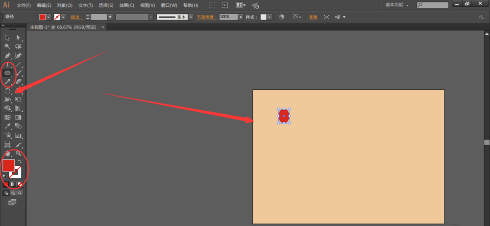 2、选择椭圆工具,填充一个颜色,然后在画布中,绘制一个小椭圆,如图