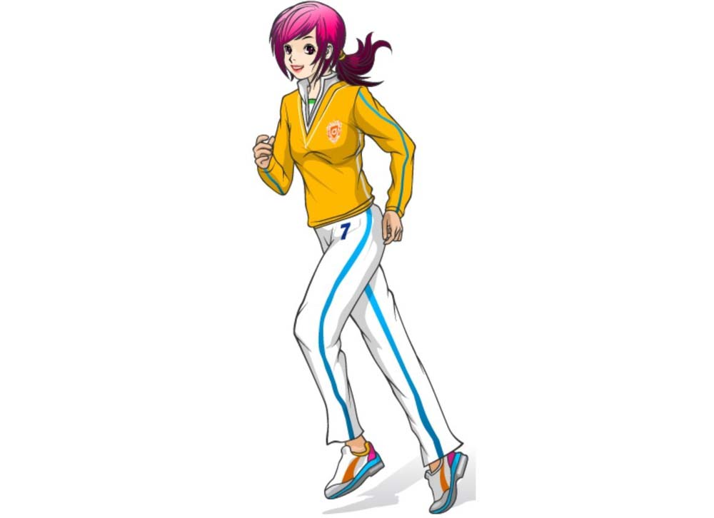 8、设置橙色填充女孩的服饰上衣部分,在领口与手臂上的条纹用黄色、天蓝色、白色填充。用白色填充长裤,长裤上面的条纹用天蓝色填充,鞋子用白色、天蓝色、粉红色、橙色搭配填充,完成跑步女孩漫画设计。