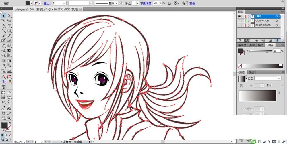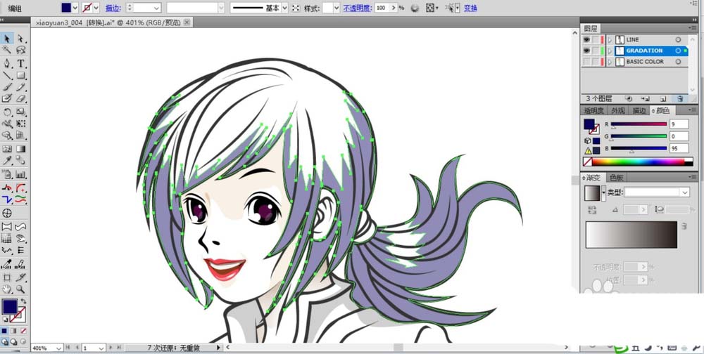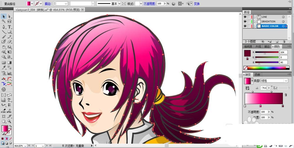 7、完成暗区填色之后就可以进行正常的填充色彩了,设置一个粉红色的渐变来填充女孩的头发路径。使用粉色填充女孩的脸蛋。
