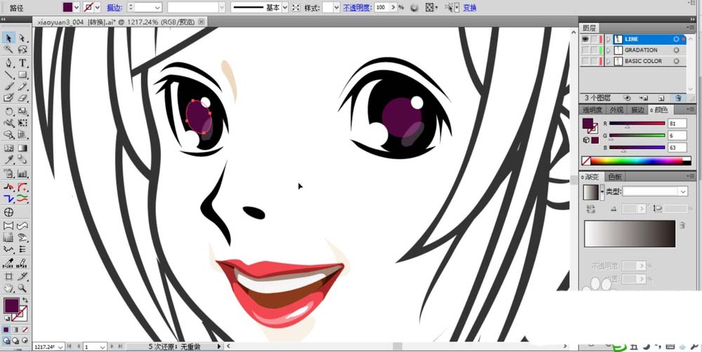 2、使用紫色与灰黑色搭配填充女孩的眼晴,使用红色与白色填充嘴巴,重点应用正片叠底的技巧来呈现嘴巴的明暗肤色变化。