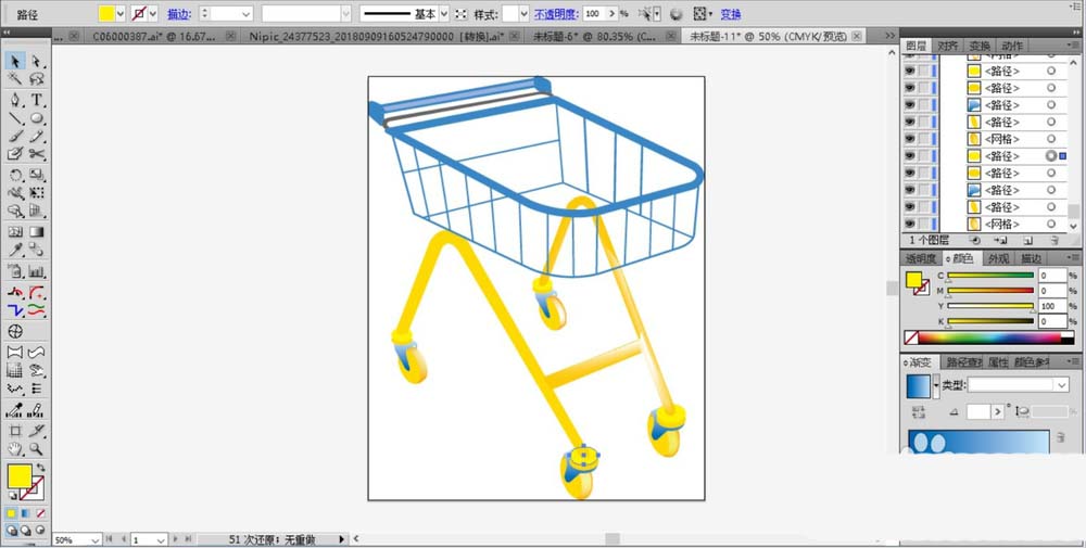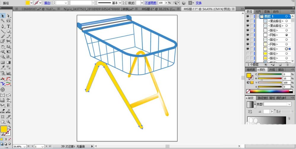 4、继续用钢笔画出购物车下方的支撑架,我们用黄色的渐变来填充这个粗粗的支撑架,网格渐变可以让亮区一侧的支撑架呈现出立体的观感。
