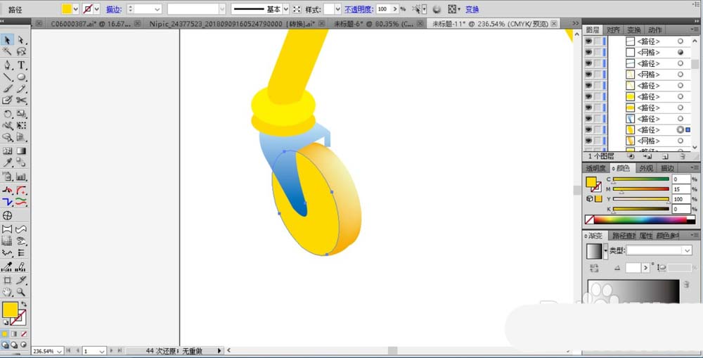 5、继续用钢笔工具勾勒出车轮的结构,我们用橙黄色填充腿部路径,再用蓝色的渐变填充圆轮上方的结构件,用黄色的网格渐变填充下方的车轮。
