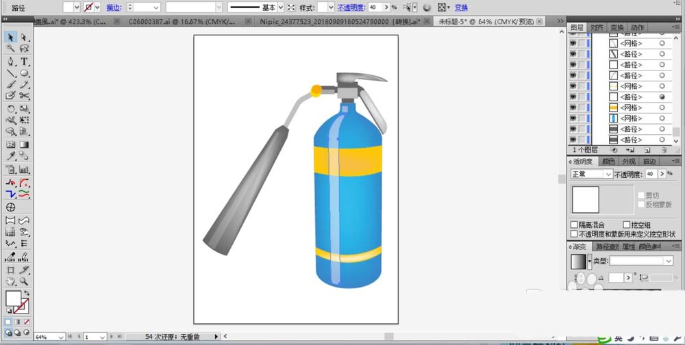 6、我们使用网格工具给喷管做出金属的材质效果,在喷管上面的亮区与灭火器主体上面的亮区填充一个半透明的白色,从而完成灭火器图片设计。