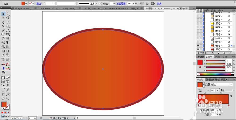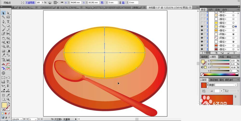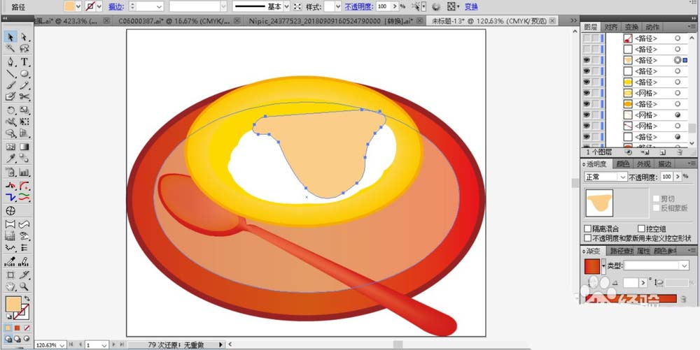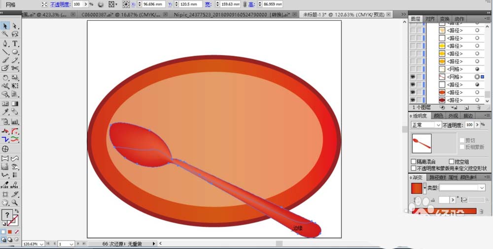 2、复制圆形让其缩小80%,再设置成半透明的状态,这就是餐盘的底部,我们使用钢笔工具画出小勺子,并用网格渐变的方法填充红色的渐变。
