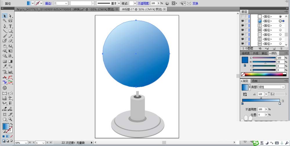 4、继续使用圆形工具绘制一个蓝色的渐变圆形,我们把这个圆形作为地球仪的主体。