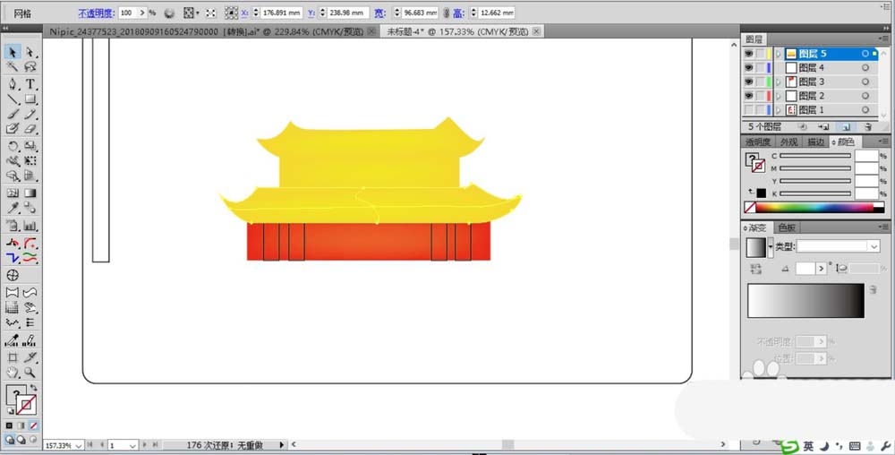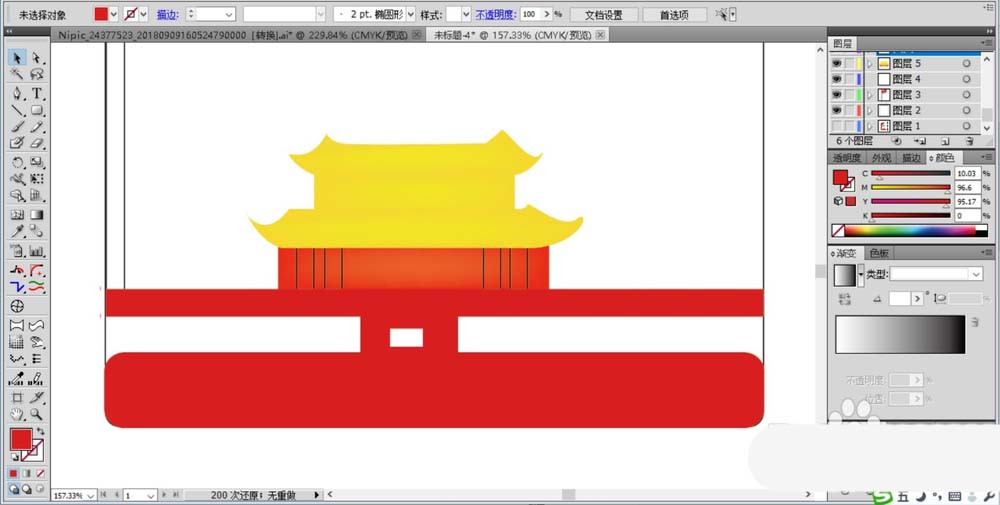 5、在画面的下方画出城楼的基本轮廓,上面两层楼填充黄色,下方的一层填充红色,再出几个门的基本轮廓并做一下黑色的描边。(也可以使用网格渐变为城楼作出一个黄色的渐变与红色的渐变)