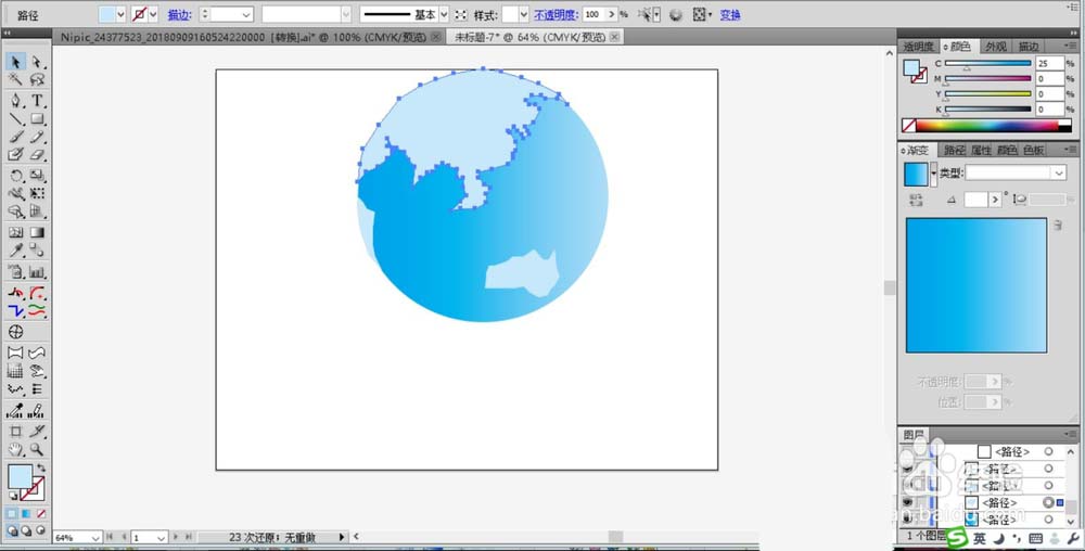 2、在圆形上面画出代表陆地的轮廓并填充一个灰白色的渐变。