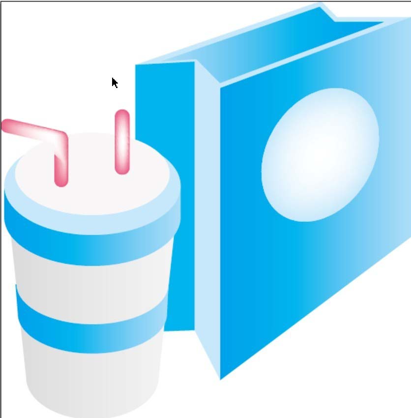 4、使用圆形工具,在包装袋的右侧面画出一个椭圆并填充灰白色的渐变。再用钢笔在包装袋的左侧画出一个饮料杯的主体正面路径并填充灰白色的渐变。