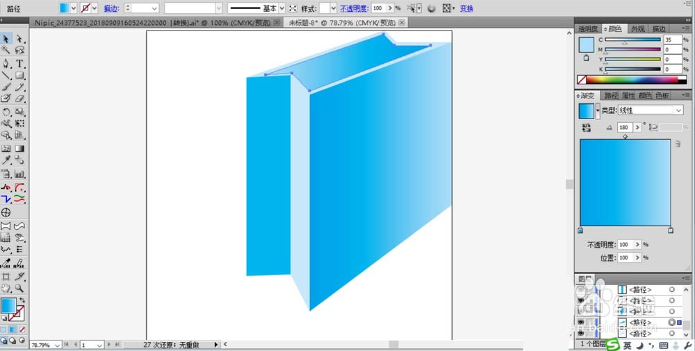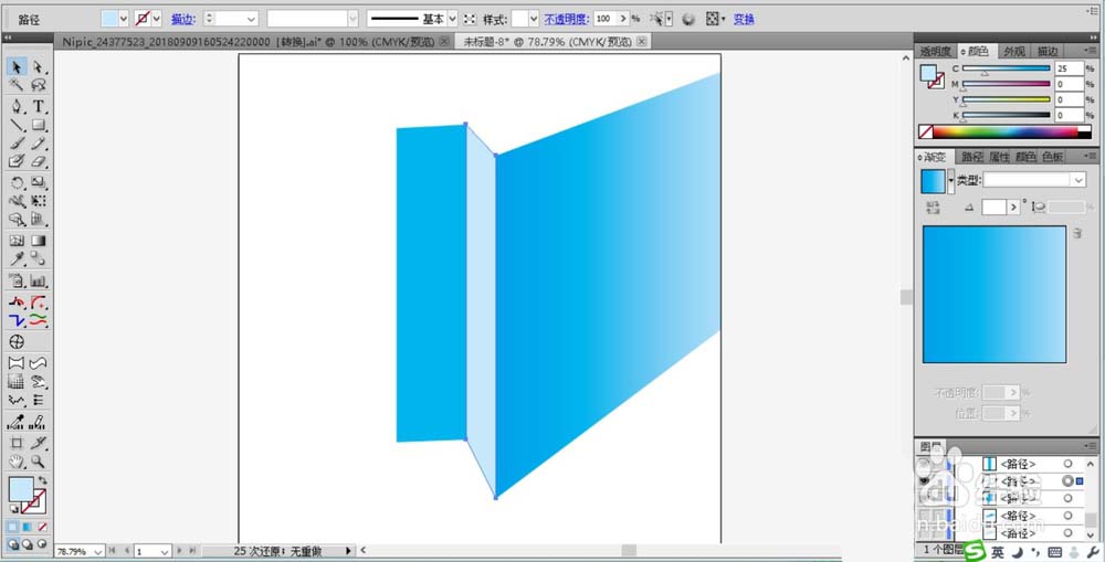 2、继续画出包装袋的左侧面的两个封闭路径,一个填充蓝色,一个填充淡蓝色。