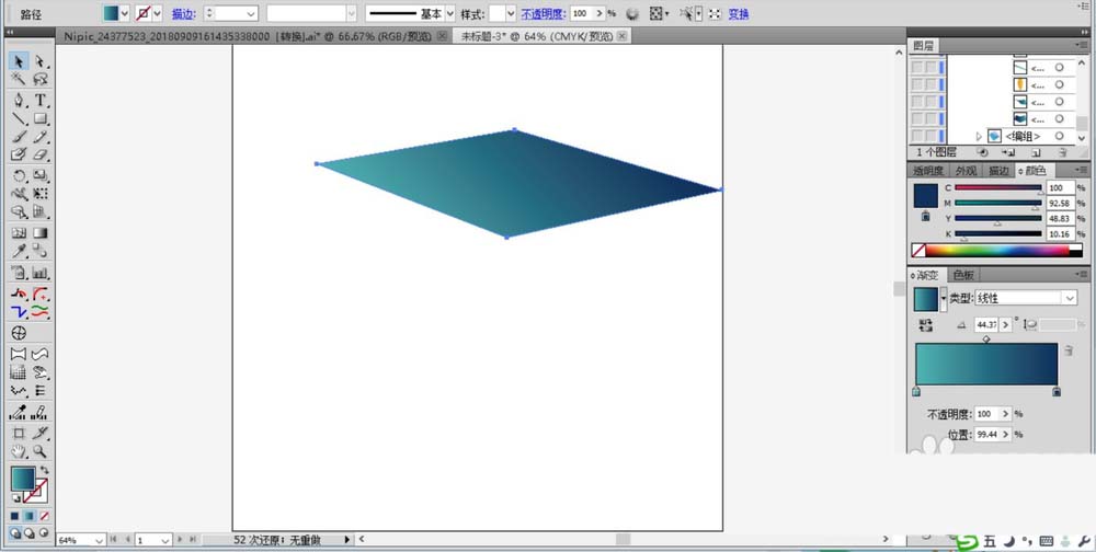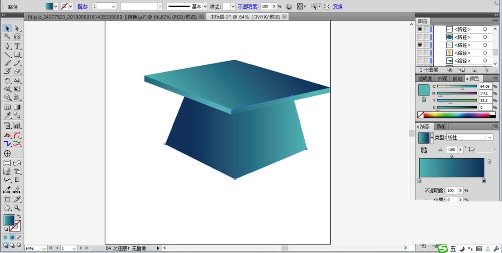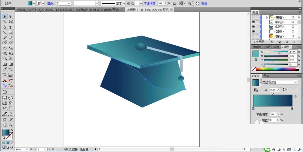 2、绘制出博士帽下方的形状并用青色的渐变填充,注意调整一个角度,让左侧暗一些,右侧亮一些。绘制出博士帽上方的左侧面与右侧面,我们用较亮的青色渐变填充。