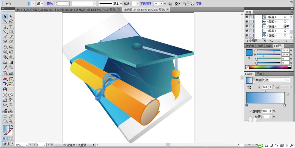5、绘制好博士帽之后就可以再来绘制一下这个证书了,我们使用钢笔绘制出证书的左侧面与上面,还有右侧面的基本轮廓,分别填充橙色的渐变与灰色的渐变,证书中间还有蓝色的绳索,我们用蓝色的渐变填充。
