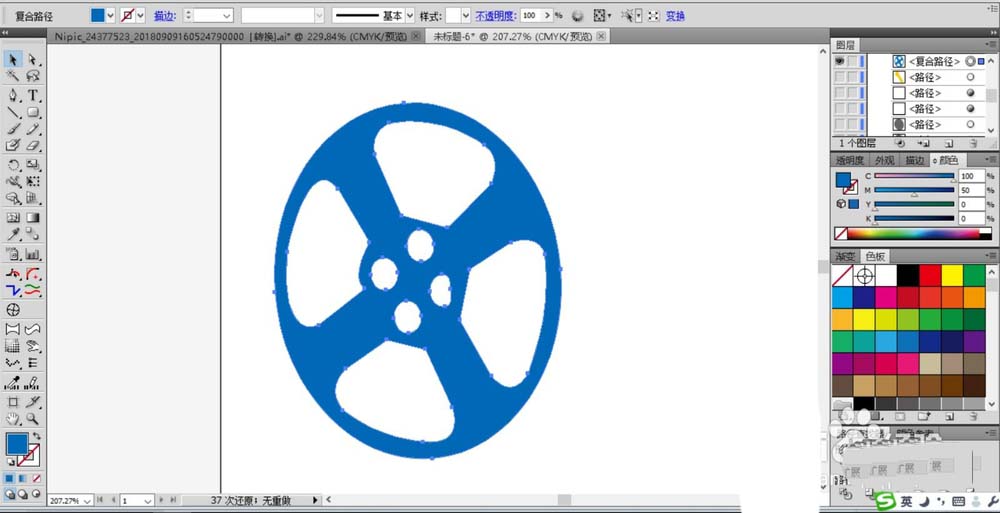 1、使用钢笔工具画出放映机圆盘相关的主要元素,扇形、圆形,我们把这些元素一一与放映机的圆盘结合,用白色填充元素,用蓝色填充放映机的圆盘。