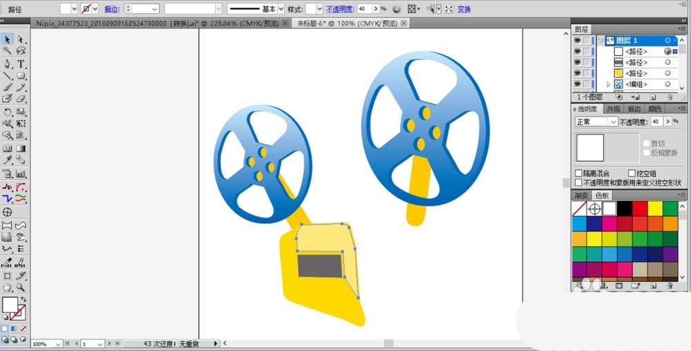 4、绘制好两个放映圆盘之后,我们就可以绘制下方的不规则箱体,先画出箱体的正面,亮区用半透明的白色填充,暗区用灰黑色填充,主体用黄色填充。