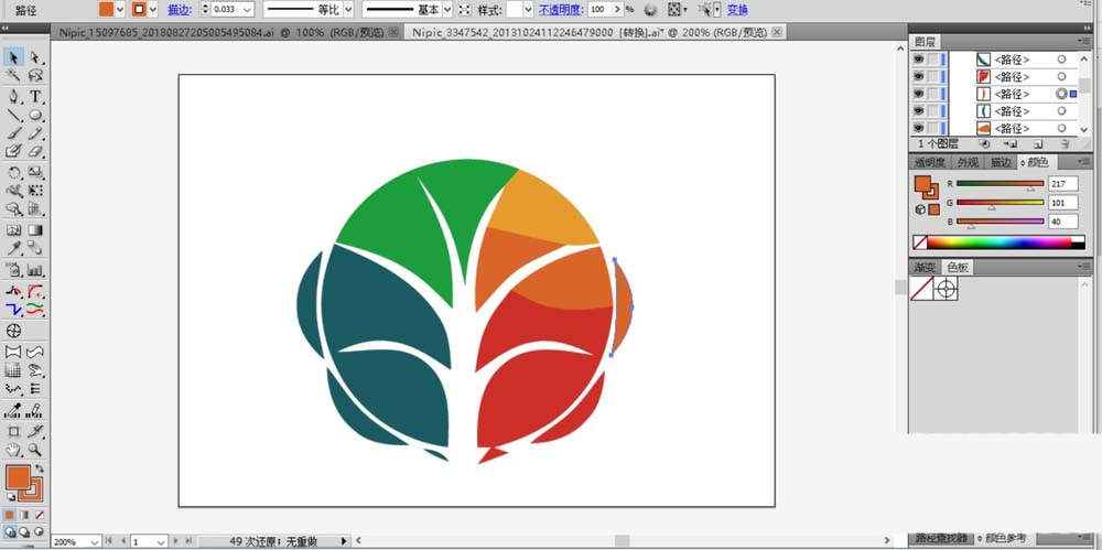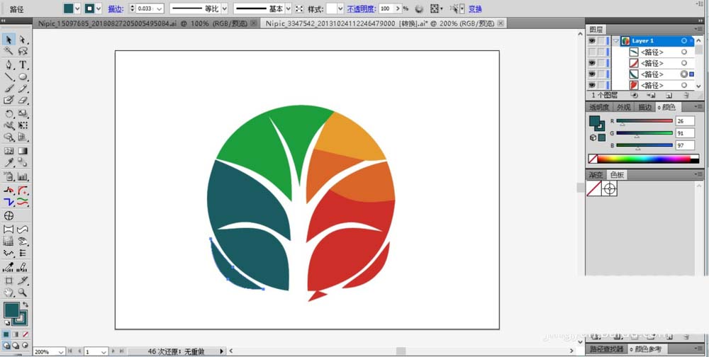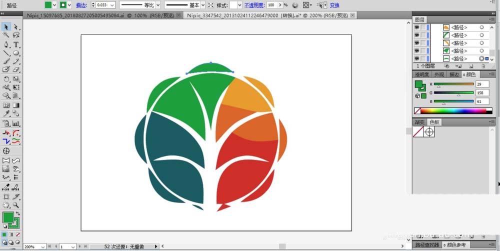 6、最后,我们在标志的顶端绘制出绿色的圆弧块与橙黄色的圆弧块,完成教育行业标志设计。