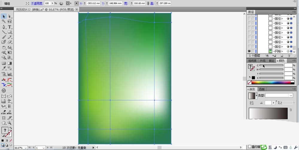 1、选择绿色作为前景色,我们绘制出一个绿色的背景,再使用网格工具让背景呈现出白色与绿色的渐变效果,更具质感。
