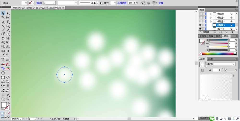2、用圆形工具画出白色的光圈,使用一下白色的渐变与高斯模糊的滤镜,让白色的光球更加的梦幻。复制出多个白色的光球,让其在画面的中间位置。
