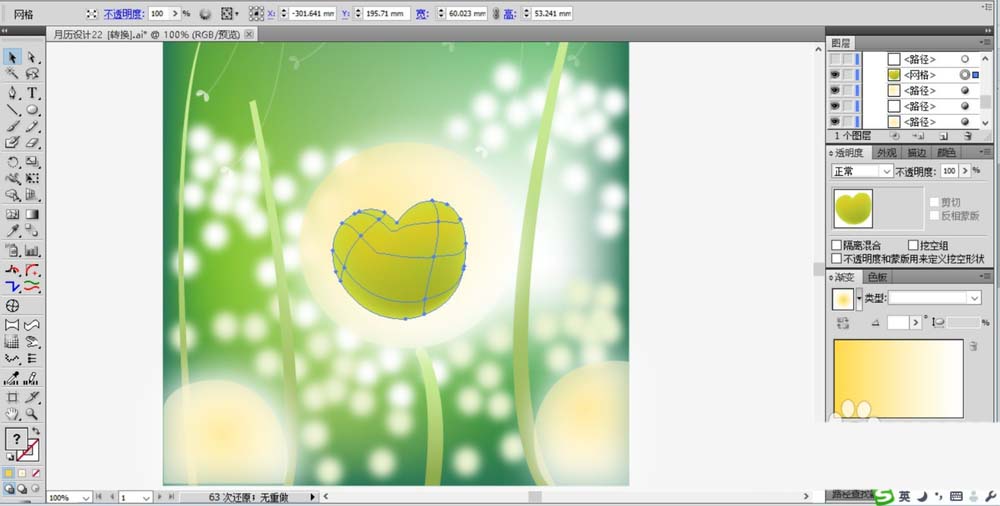 6、复制这种复合的光球,在画面的中间我们绘制出一个绿色的心形在光球的中间,心形的表面用网格做出绿色渐变的效果。