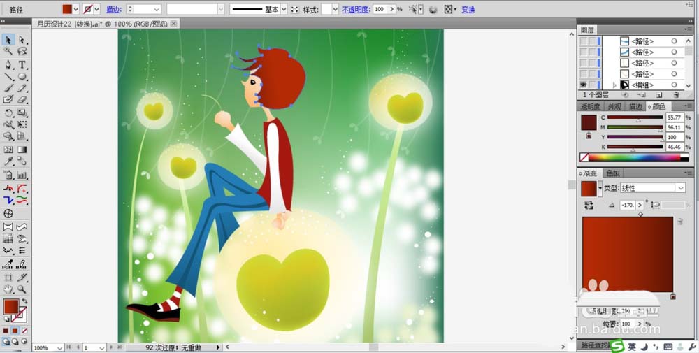 7、在大光球的左侧绘制出一个男孩的轮廓路径,服饰用红棕色与蓝色的搭配,基本的动作为一手举起,一手放在光球上面。皮肤为粉色的渐变,头发为红棕色。鞋子为灰黑色,袜子为红棕色与白色的搭配。
