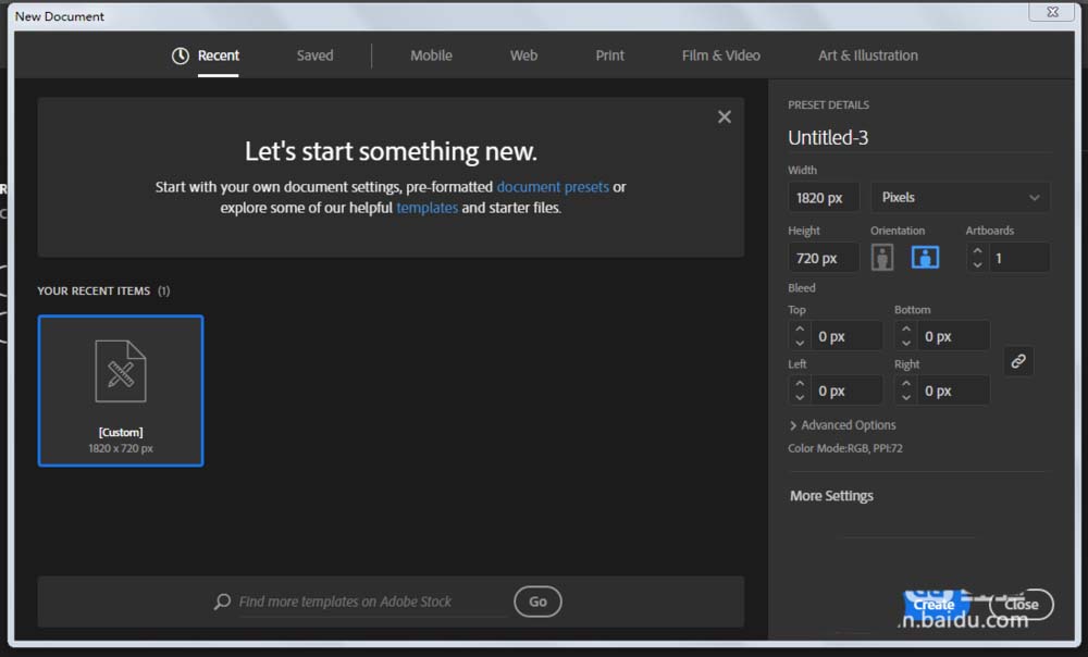 1、新建一个1820*720,颜色模式RGB的文档。