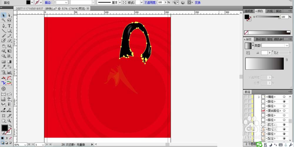 1、先画出红色的背景,再使用圆形工具把广告画背景当中的圆弧一一截取出来,我们可以使用路径截取的办法,让需要的圆弧一一呈现并填充为暗红色。