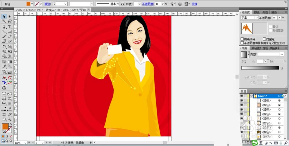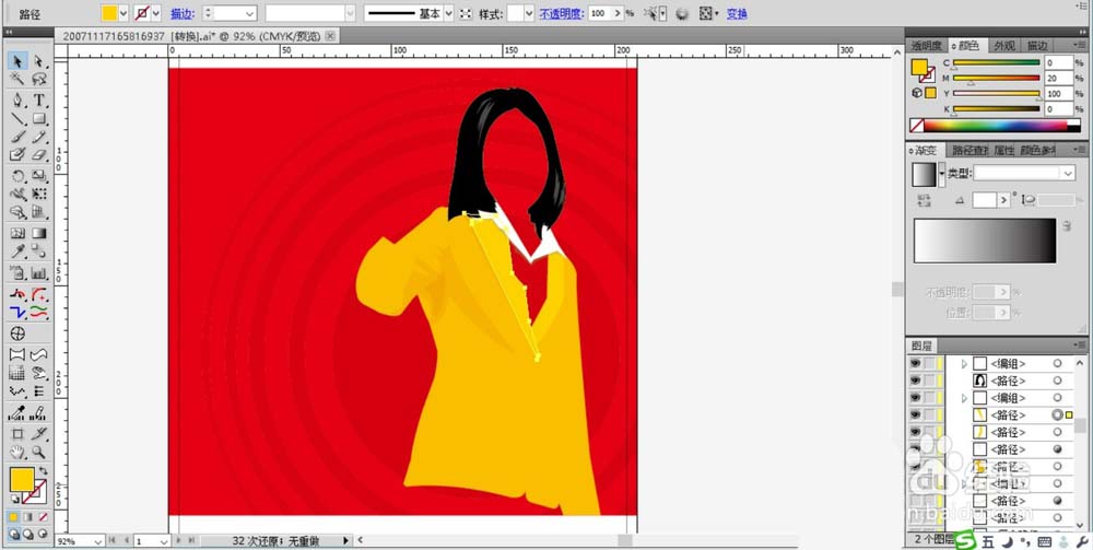 3、画出女人的服饰路径,这是一件西服,我们用橙黄色填充服饰路径。