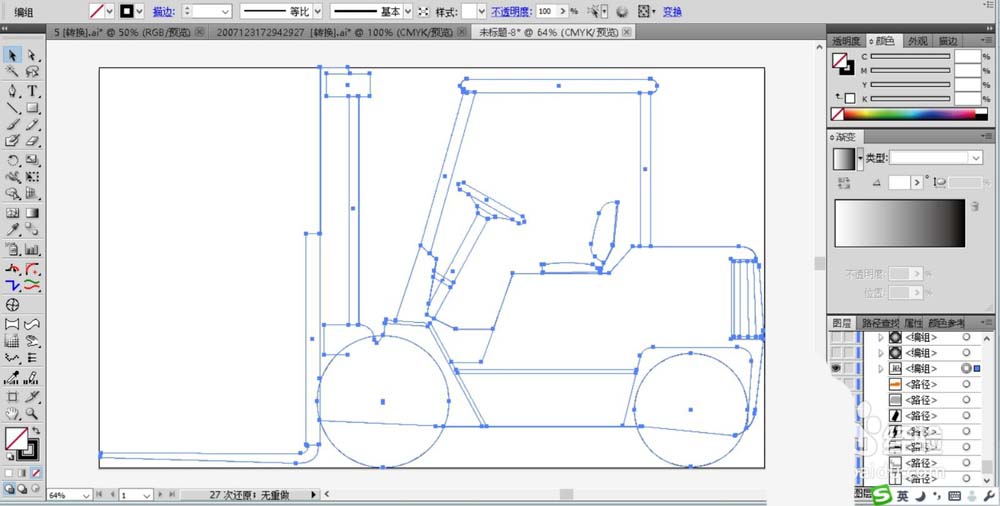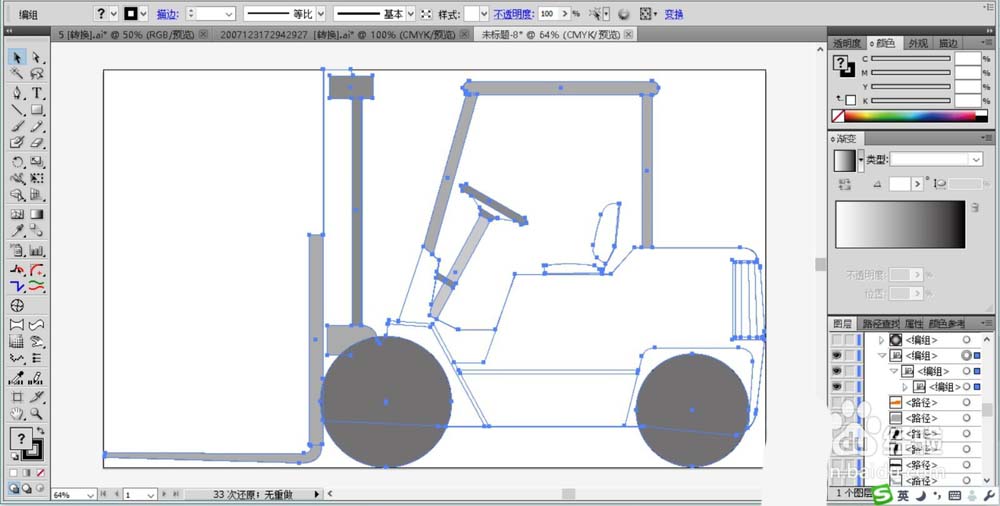 1、先用细线条画出叉车的侧面图路径,从中分析一下叉车的基本结构,各个元素的具体位置,我们只要综合使用圆形、矩形、钢笔工具就可以画出来。