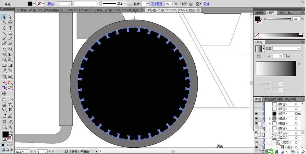 3、这一步开始描绘车轮的细节,使用CTRL+D这个快捷键的功能快速为圆形的车轮事出一个圆圈的小矩形缺口。