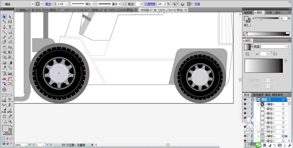 5、绘制好第一个车轮的细节元素之后,我们复制到右侧的车轮上面。