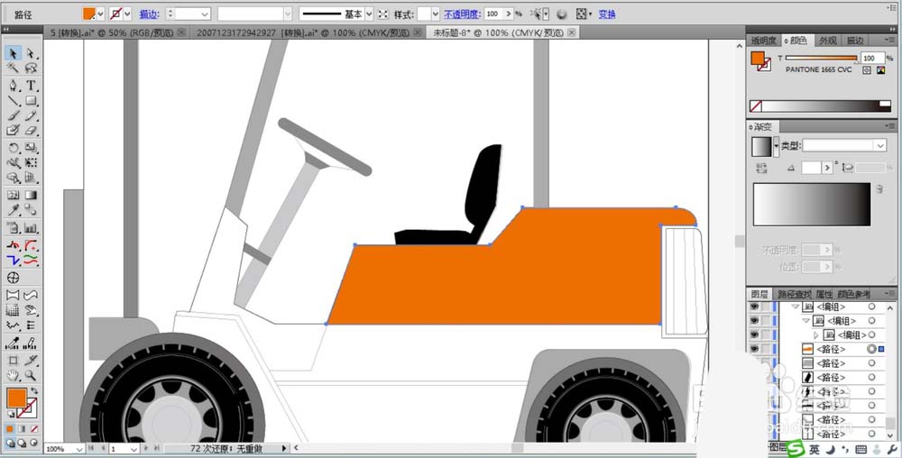 6、继续为叉车填色,我们填充车椅为黑色,后方的车体填充橙色。