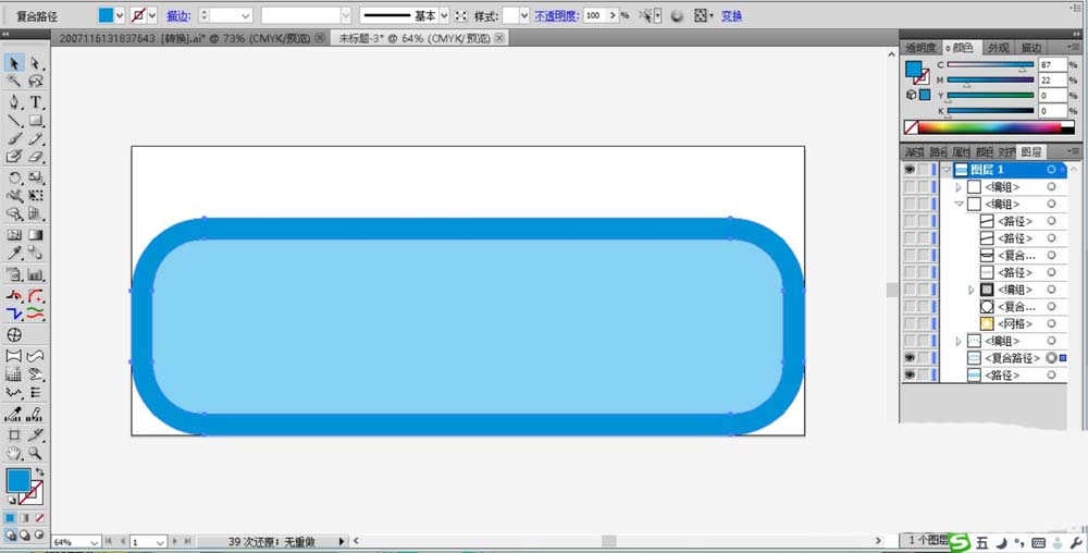 2、复制这个圆角矩形并放大到108%左右,我们让其与原来的矩形组合成为一个复合路径并填充深蓝色。