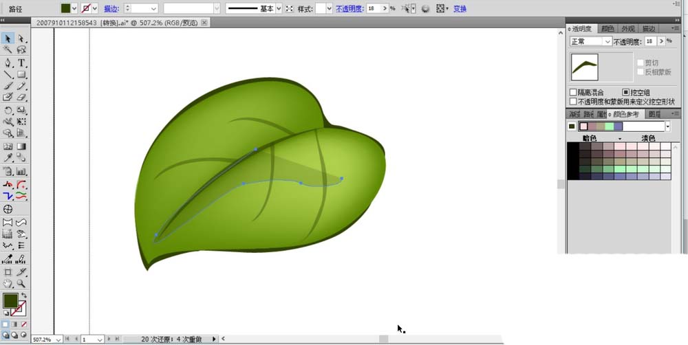 3、继续在绿叶的表面画出它的茎杆路径,我们用深绿色填充,画出绿叶表面的暗区,我们用正片叠底的绿色来填充并设置成透明度为40%左右。