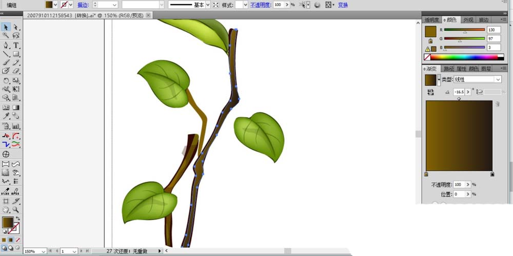 4、用钢笔画出山茶花的枝条路径,并用暗绿色、褐色、深棕色等多种近似色调填充,用上一步同样的办法绘制出更多的绿叶在枝条上面。